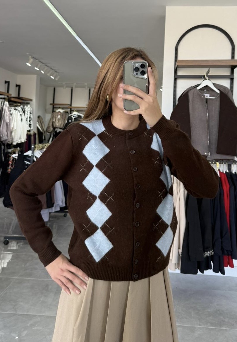 mavi baklava dilimli kahverengi yumuşak hırka
